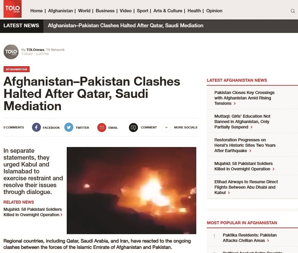 قادت دولة قطر والمملكة العربية السعودية جهودا لتهدئة التوتر على جانبي الحدود الافغانية الباكستانية، بعد اشتباكات اندلعت بين الجانبين وأسفرت عن مقتل عدد من الجنود من كلا البلدين. وأعلن المتحدث باسم الحكومة الأفغانية في مؤتمر صحفي أنه بناءً على طلب قطر والمملكة العربية السعودية، تم وقف الأعمال العدائية بين الجانبين. ومع ذلك، حذر من أن أي إجراء إضافي من جانب باكستان سيُقابل برد مناسب من جانب افغانستان.