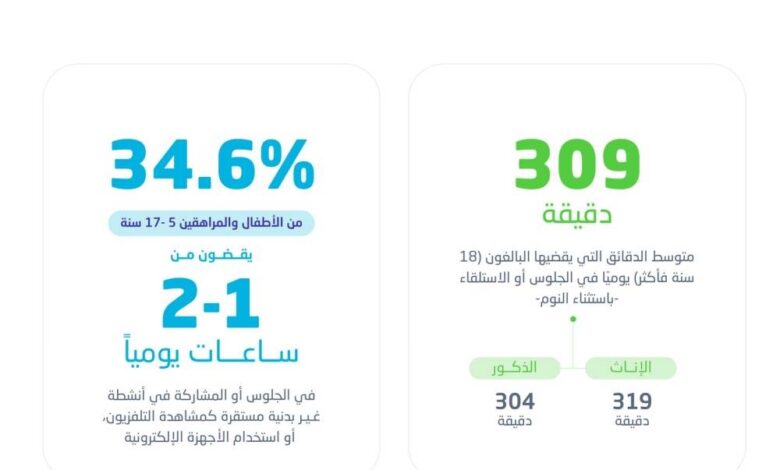 يذكر أن تقديرات نشرة إحصاءات النشاط البدني تستند إلى البيانات المُبلّغة ذاتيًا من الأفراد أو مقدمي الرعاية، وتستعرض مؤشرات النشاط البدني من خلال الإبلاغ الذاتي لسكان المملكة البالغين (18 سنة فأكثر) والأطفال والمراهقين (من عمر 5 إلى 17 سنة) وتعتمد دقة البيانات على نتائج المسح الصحي الوطني، ومسح صحة المرأة والطفل لعام 2025م، والتقديرات السكانية من الهيئة العامة للإحصاء لعام 2025م.