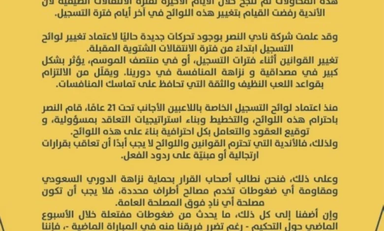 البيان، الذي أكّد رفض النصر لأي تعديل في أنظمة تسجيل اللاعبين الأجانب تحت 21 عامًا خلال الموسم الحالي، حصد أكثر من 16,000 إعجاب، و10,000 إعادة نشر، و17,000 اقتباس، ما يعكس قوة حضور النادي في المشهدين الرياضي والقانوني.