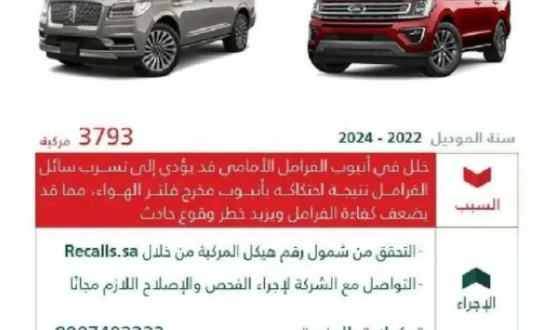The Ministry of Commerce has recalled (3,793) vehicles (Lincoln – Navigator) and (Ford – Expedition) from the model years (2022 to 2024) due to a defect in the front brake line, which may lead to brake fluid leakage as a result of contact with the air filter outlet pipe; this weakens brake efficiency and increases the risk of an accident.