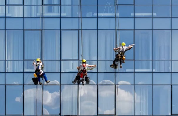 بالفيديو| الرياح القوية تعصف بعمّال تنظيف واجهات في إسطنبول