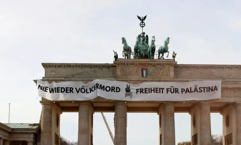 نشطاء يتسلّقون بوابة شهيرة في برلين ويرفعون لافتة الحرية لفلسطين
