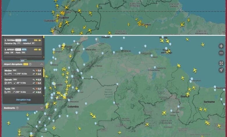وعكست الخرائط الجوية المباشرة – عبر موقع “فلايت رادار” – التأثير الفوري للتصعيد الأمريكي، إذ اختفت الطائرات التجارية تقريبا من الأجواء الفنزويلية إثر إعلان ترامب الذي كان قد صرح مؤخرا بأن “العمليات البرية” ضد شبكات تهريب المخدرات في فنزويلا ستبدأ “قريبا جدا”.