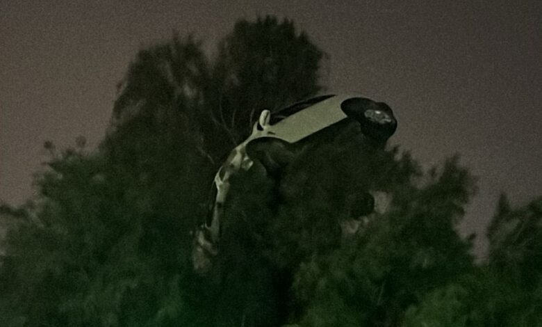 سيارة فوق الشجرة.. مشهد تمثيلي يتحول لأغرب حادث مروري في الكويت (فيديو)