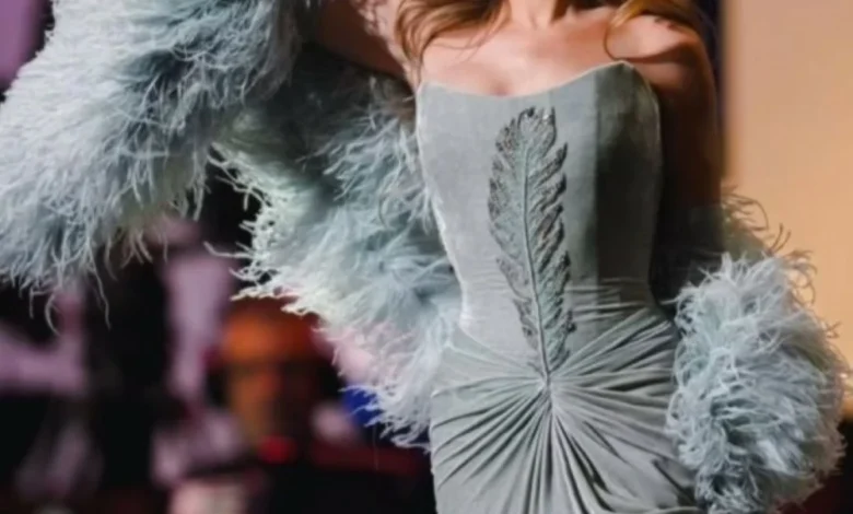 The upper part featured a clearly defined corset design, enhancing her strong presence on stage, complemented by long gloves made of the same material that reinforced the theatrical character and gave the look a luxurious vintage touch reminiscent of global divas. The addition of feathers was not a random element, but rather a clever detail that added visual balance between the rigidity of the design and the softness of the scene.