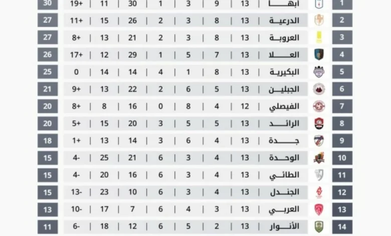Abha recorded the highest number of victories so far with 9 wins, followed by Al-Dhariyah, Al-Orobah, and Al-Bukayriyah with 8 wins each, then Al-Ula with 7 wins. Al-Faisaly remains the only team that has not suffered a loss so far, while it is also the most drawn team in the league, recording 8 draws alongside 4 wins.
