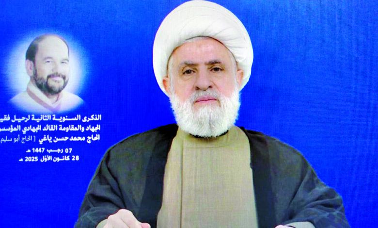 وأضاف قاسم: «نزع السلاح مشروع إسرائيلي أمريكي حتى لو سمّي رسمياً حصرية السلاح»، مؤكدا أن نزع السلاح جزء من مشروع إيجاد الفتنة بين المقاومة والناس وإبقاء الاحتلال للنقاط الـ5 وأن يبقى يقتل بلا محاسب». وقال: «الحكومة اللبنانية قدمت للعدو تنازلات مجانية فيما العدو لم ينفذ شيئاً من الاتفاق. المقاومة التزمت ولبنان التزم بمضمون الاتفاق بينما إسرائيل استمرت بالدخول الأمني إلى لبنان». واعتبر أن ما أنجزه الجيش اللبناني من الانتشار في جنوب الليطاني خلال الفترة الماضية كان مطلوباً إنجازه في حال التزم العدو ببنود اتفاق وقف إطلاق النار».