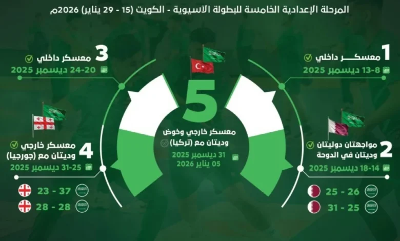 ومن المقرر أن تنطلق المرحلة السادسة من البرنامج الإعدادي بعد غدٍ الخميس، وتستمر حتى (13) يناير 2026، حيث تتخللها مواجهتان وديتان في يومي (10) و (11) يناير، للوقوف على الجاهزية النهائية قبل التوجه إلى الكويت لخوض غمار البطولة الآسيوية.