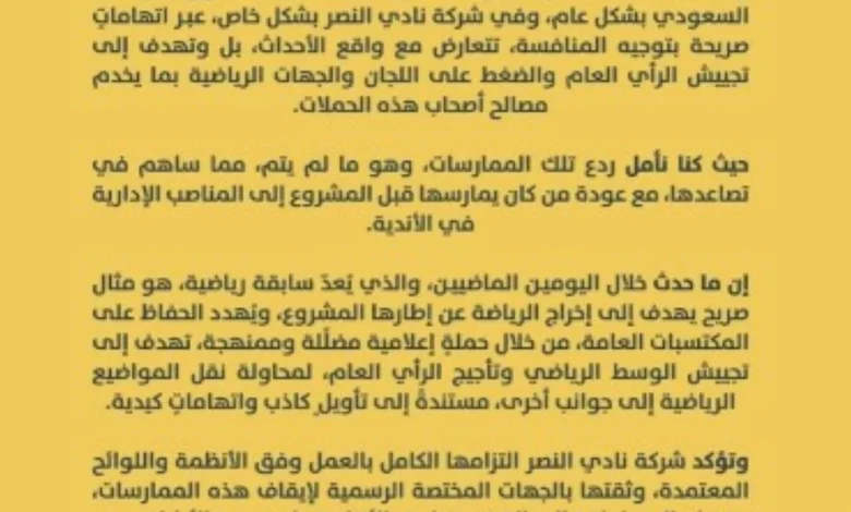 The management stated in its announcement: Al-Nasr Club affirms its full commitment to operate in accordance with the approved regulations and laws, and its trust in the official competent authorities to stop these practices, ensuring equality and justice in the application of regulations to all parties without exception, in a manner that preserves the integrity of competition and limits any attempts to create media narratives or organized campaigns that undermine the Saudi sports project and its pillars.