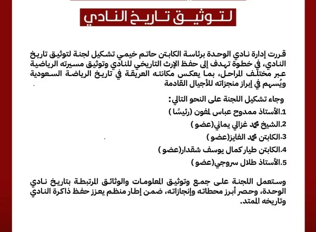 The committee aims, as announced, to review historical sources and archives related to the club’s history, in addition to benefiting from testimonies and historical narratives related to its journey, with the goal of providing an organized documentation material that preserves the club’s memory and history in the Saudi sports scene.