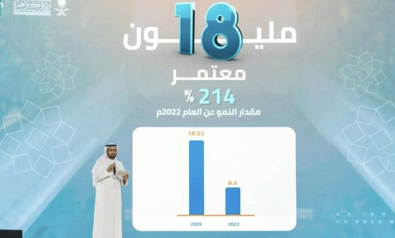 وبيَّن أن عدد المعتمرين القادمين من خارج المملكة هذا العام بلغ (18) مليون معتمر، بنسبة نموَّ تجاوزت (214%) مقارنة بالعامين 2022 و2025، منوهًا بالدعم والتمكين الذي توليه قيادة المملكة -أيدها الله- وعنايها القصوى لقطاع العمرة والزيارة، وللجهود التي تستهدف رعاية ضيوف الرحمن وخدمة قاصدي الحرمين الشريفين.